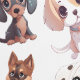 Ein niedliches Puppy Dog-Muster mit Aquarellbildern verschiedener Hunderassen wie z.B. , Dalmatiner, Deutscher Schäferhund, Bulldog, Mops, Poodle, Spaniel. Eine hübsche niedliche Tapete für Hundehütten, Groomere, Haustiere, Kinderzimmer und Kinderzimmer.