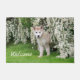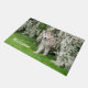 Ein junger Alaskan Malamute Welpe mit einem üppigen Doppelmantel stehend in einer Wiese mit weißem Blütenstrauch im Frühling. Ein niedliches Hund-Foto von Katho Menden, dieses Doormat ist eine Geschenkidee für Hunde und Liebhaber von Haustieren.