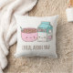 Ein Kissen mit dem Doodle einer Schüssel Frühstückszerealien mit Liebe-Form Körner und ein Milchpaket in den süßen Pastellfarben Blau und Rosa. Die Wortmarke lautet "Cereal About You". Awww...