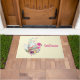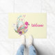Begrüßungstürmatte mit niedlichem Aquarellbild eines hellgrünen Eis, das in einem Korbkorb sitzt. Mit Bändern, Bögen, Blume und kleinen Herzen dekoriert. Ein rosa Flamingo und ein weißes Hasen an der Seite.