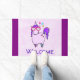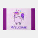 Eine willkommene Tür mit einem skurrilen zeichn eines coolen und funky rosa Kubus Einhorn mit lila Mane und Schwanz. Diese niedliche Kreatur trägt eine herzförmige Sonnenbrille und ist mit kleinen Sternen dekoriert. Rosa Aquarellhintergrund mit einem Streifen Magenta entlang der links und rechten Grenze.