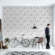 Niedliches Halloween Toile de jouy Design, mit mehreren Katzen und anderen Charakteren. Handgezeichnet in einem vereinfachten Gravierstil mit schwarzen Linien auf weiß.