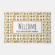 Eine willkommene Tür mit niedlichem gemustertem Hintergrund. Weiße Bienen und Regenbogen mit kleinen Herzen und Sternen verstreut herum. Schön und angenehm. Ein Rechteck, das oben mit dem personalisierten Text übereinander liegt.