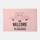 Eine Begrüßungsmatte, die sagt: Willkommen in unserem Schweinestall, personalisiert mit Ihrem Familiennamen. Entworfen mit einem zeichn eines niedlichen rosa Schweinegesichts. Tragen einer schwarzen Bogen-Krawatte. Von seinen schwarzen Klauenhofen erheben und über einen Tisch pinkeln. Niedlicher und skurriler zeichn. Set auf einem rosa Hintergrund mit einigen verblassten Herzen hier und da.