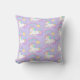 Ein Kissen mit der Abbildung eines niedlichen und kawaii Einhorns, das friedlich mit einem extravaganten, lockigen Mann und Schwanz schläft. Ein farbenfroher Regenbogen hinter einem Sternschuss . Hintergrund ist ein weißes und lila Polka-Punktmuster. Schönes Fantasiedesign.