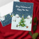 Friedlich schneebedeckte Nacht im traditionellen Weihnachtsdorf mit einem wunderschönen Weihnachtsbaum inmitten kleiner Häuser mit Kiefern, Vögeln, Hasen und Eichhörnchen. In diesem bezaubernden Weihnachtsdorf zeichne sich unter einer glänzenden weißen Decke eine ruhige, verschneite Landschaft. Das charmante Dorf, eingebettet inmitten der schneebedeckten Hügel und Pinienbäume, besticht durch hübsche Hütten, in denen aus den Kaminen rauchende Rauchkuchen verströmen und eine warme und gemütliche Atmosphäre ausstrahlen. Im Herzen des Dorfes befindet sich ein hübscher Weihnachtsbaum, geschmückt mit lebhaften Ornamenten und einem strahlenden Stern. In der Nähe bewundern ein niedliches Hasen und ein freundliches Eichhörnchen das Spektakel. Die Landschaft des Winterdorfes ist voller Ruhe und Freude, die das Wesen der Ferienzeit einprägt. Schneeflocken tanzen in der Luft und schaffen den Zauber des Winters und die Wärme der Feierlichkeiten in einem Storybook-ähnlichen Ambiente.
