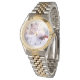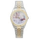 Eine Damenuhr mit einem Foto eines Ingwer-Kätzchens, das auf einer weichen, weißen und roten Weihnachtsmannmütze sitzt. Unscharfe glitzernde Lichter auf beide Seiten. Art Deko Uhr Gesicht.
