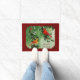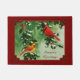 Ein Paar männlicher und weiblicher nördlicher Kardinäle stehen in einem Stollenbaum, während ein dritter Kardinal auf einem gewebten Holzkorb sitzt, der mit frisch gepflückten, heiligen Blätter und Beeren gefüllt ist. Bild erstellt aus einem originalen Ölgemälde von Crista Forest.