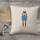 Ein Weihnachtskissen mit einer Abbildung eines Nutcrackers und einigen Sternen auf hellbraunem Hintergrund. Ideal für Ihre Weihnachtsdekoration.