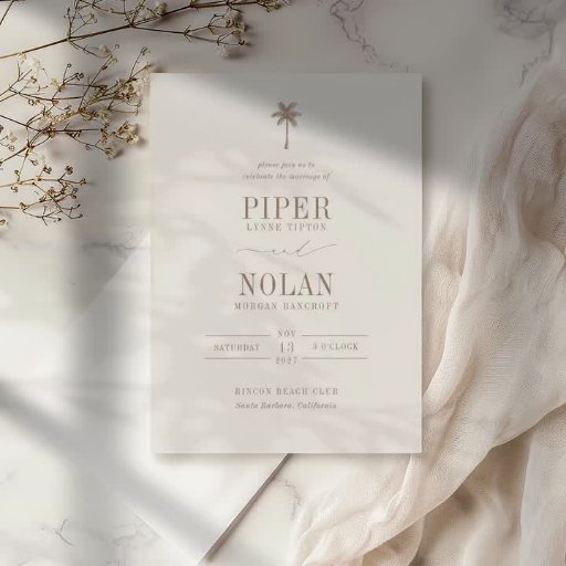 OASIS | Sandy Neutral Taupe, wedding beverage bottle label. Features, taupe typography on sand beige and palm tree illustration.