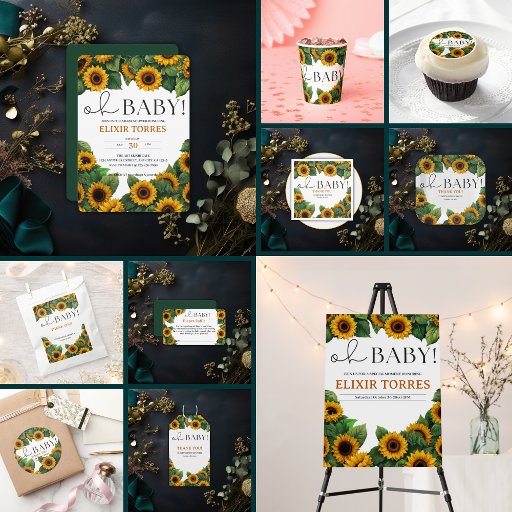 Oh Baby" Moderne elegante Sonnenblumendusche EinladungOh Baby" Moderne elegante Sonnenblumendusche Einladung (Vorderseite)Oh Baby" Moderne elegante Sonnenblumendusche Einladung (Rückseite)