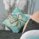 Aqua Hintergrund, Aquarellbogen und eine grün getönte Vintage Oktopus-Illustration verleihen diesem Kissen ein modernes Aussehen.