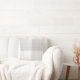 Die Einrichtung ist in Weiß- und Grautönen gehalten. Dieses Kissen kommt in vielen Farben, die in der Kissenkollektion gezeigt werden.
