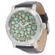 Diese Armbanduhr hat ein hübsches opal-broches Fichendentmuster mit Goldketten. Dieses einzigartige, bedruckte Design ist so gestaltet, dass es wie in einem Mosaik auf einem schwarzen, anpassbaren Hintergrund angeordnet aussieht. Die ovalen Formen haben ein undurchsichtiges Perlmutt mit blauen, grünen und weißen Wirbel. Es ist ein schönes, originelles Muster. Die Zahlen werden in goldenen römischen Zahlen auf einem schwachen ovalen Hintergrund gemacht.