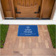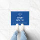 Elegantes Open House Real Anwesen Door Mat Template in einem modernen minimalistischen Stil auf einem stilvollen blauen Hintergrund. Sie können Ihr Firmenlogo und Ihre Kontaktdaten (Telefon, E-Mail, soziale Medien usw.) hinzufügen. Ideal für jede Immobilie, die Agentur und echte Anwesen-Agent auflistet.
