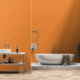 Dieses elegante Tapete mit weißem Rautengittermuster auf orangefarbenem Hintergrund. Ein perfekter Akzent für Ihre Wohngestaltung.