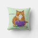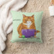 Eine niedliche Orangenkatze, die vor einer lila Tasse Kaffee sitzt, im Hintergrund von Grün