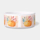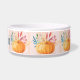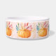 Eine personalisierte Schüssel mit gestreiftem Hintergrund in Rosa und Gold. Ein wiederholtes Bild eines orangefarbenen Kürbchens mit bunten Blätter.