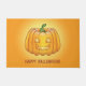 Desteis niedliche Cartoon Illustration eines orangefarbenen Halloween Jack O'lantern Kürbis mit einem fröhlichen Gesichtsausdruck geschnitzt. Es gibt auch einen personalisierbaren Textbereich, der jetzt "Happy Halloween!" lautet.
