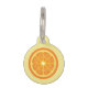 Coole Cartoon Illustration nachahmt das Aussehen einer frisch geschnittenen, köstlichen Orangenfrucht. Die Hintergrundfarbe ist hellgelb. Auf der anderen Seite gibt es personalisierbare Textbereiche für den Namen des Tieres und für eine Telefonnummer.