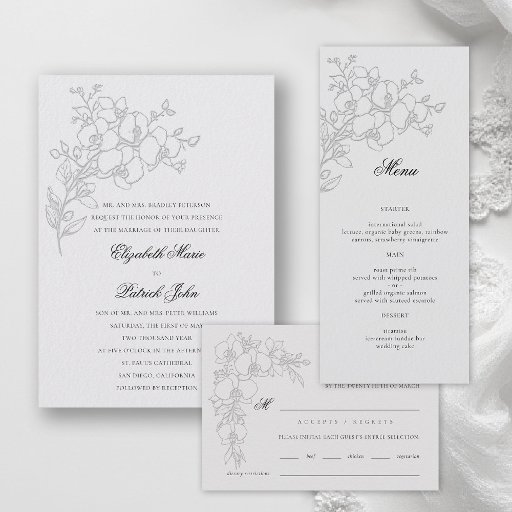 Designed for couples seeking romance and refinement, Orchid Waltz pairs beautifully with parent-hosted celebrations, elegant ballroom venues, or classic church ceremonies. Its delicate orchids, flowing curves, and soft ivory palette set the tone for your unforgettable wedding day. This invitation coordinates seamlessly with matching RSVP cards, envelopes, and reception inserts, creating a cohesive, elevated stationery suite that your guests will cherish.