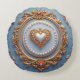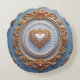 Luxurious circular frame with a gilded, intricate border featuring red heart gems, pearls, and gold flowers. Rich blue and crimson backdrop evokes romance, elegance, and timeless celebration perfect for luxury decor or jewelry visuals.