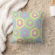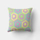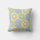 Dieses Kissen hat ein geometrisches Design von Hexagons in blassblau, blassgelb und blassgrün auf einem Streifen in blassrosa und blassrosa lila.
