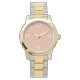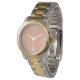 Diese Frauenuhr hat ein Osterdesign aus geteilten Kreisen auf Linien in grün, blau und lila auf einem orangefarbenen Feld.