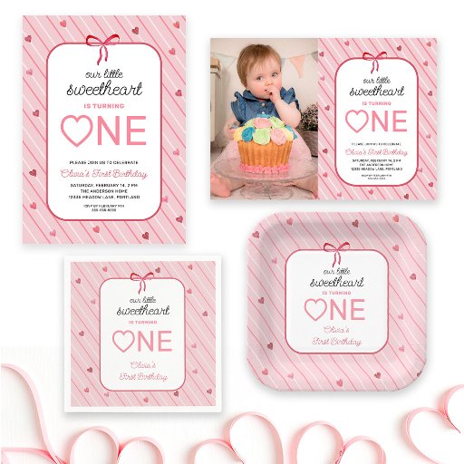 This charming sweetheart-themed birthday party napkin is perfect for a little girl celebrating her first birthday near Valentine’s Day. The design features graceful script lettering on a backdrop of white stripes and delicate watercolor hearts, finished with an adorable bow for a lovely, girly touch.