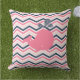 Kissen im Freien mit Zickzack Streifen in Rosa, Weiß und Marineblau mit einem niedlichen rosa Wal mit Marineblau und weißem Polka gepunktetem Wasser.