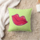 Ein Paar leuchtende rote Lippen mit einem kleinen Funkeln und einer lila und gelben Kontur. Feine weiße Highlights geben ihm einen glänzenden Look. Kalkgrüner Hintergrund.