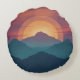 This nature inspired mountain sunset scene has layered colors and a soft painted effect. The design blends vintage outdoorsy vibes with modern minimalism, making it ideal for anyone who loves mountains, hiking, road trips, and a good golden-hour aesthetic. The teals, blues, oranges and reds make this round accent pillow a beautiful choice for your home decor.