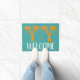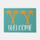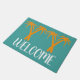 Palmen Strand Sommer Thema Willkommensmat mit orangefarbenen Palmen in einem Strandthema vor einem blau anpassbaren farblichen Hintergrund mit Begrüßungsschild. Eine heimelige, Strand Sommer-Ambiente Willkommenstür matt perfekt für Ihr Haus.