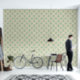 Eine kühne, sonnige Mischung aus Palmen-Blätter und Retro-Sonnen in sanftem Rosa, Grün und Orange auf einem cremefarbenen Hintergrund - lustig, hell und tropisch.