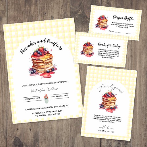pfannkuchen und schnullerpfannenstapelgemütliches babyduschthemagelbgingham kariertbrunch babyduschepersonalisierte danksagkarterustikalminimalistischerdbeere