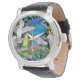 Originelles Kunstdesign von farbenfrohen Papageien der Welt, inklusive Makaws, afrikanisches Grau, Umbrella Cockatoo, Budgerigars, Cockatiels und mehr von Carolyn McFann von Two Purring Cats Studio gedruckt auf einer Qualitätsuhr für Papageienfans.