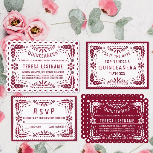 Papel picado burgundy QUINCEAÑERA Save the Date Ankündigungspostkarte