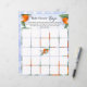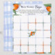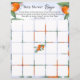 Das Blatt Papier-Spiel "Bingo" für Babydusche ist mit einer Illustration einer köstlichen Mandarine mit Blume in einem Aquarell-Stil dekoriert.