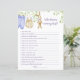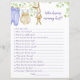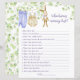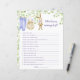 Paper Sheet game "Wer kennt die Mami am besten?" für Babydusche, Babydusche, dekoriert mit wunderschönen Aquarellbildern von niedlichen Babykleidern, die an einer Linie zum Trocknen hängen, einem niedlich gestopften Hasen und umgeben von zarten Ästen mit hellgrünen Blätter.