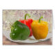 Glockengelbe, grüne, gelbe und rote Paprikaschoten setzen sich auf eine weiße Platte, die bereit zum Kochen ist. Das Original ist ein Ölgemälde von Kathie Miller