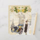 Dieses Scrapbook-Papier-Design bietet Collage of Paris Eiffel Tower, London Bridge, Blumenladen, antikes Auto und eine hübsche Dame auf dem Musiknoten Hintergrund.
