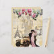 Dieses Scrapbook-Papier-Design bietet Collage of Paris Eiffel Tower, London Bridge, Blumenladen, antikes Auto und eine hübsche Dame auf dem Musiknoten Hintergrund.