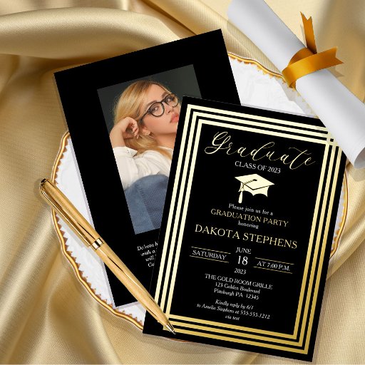 Feiern Sie Ihren Absolventen mit dieser Goldfolie auf einer grünen Hintergrund-Graduierungsparty mit Foto und Plänen / Details-Design im kühlen, modernen Stil. Der rechteckige, dreilagige Rahmen mit Treppenstufen bildet den Rahmen für das Party. Das Design umfasst auch eine Folienabstufungshülse und den Skripttext "Graduate" (nicht bearbeitbar). Composite Design von Holiday Hearts Designs (Rechte vorbehalten). Platzhalter-Template Foto mit freundlicher Genehmigung Entflechten.