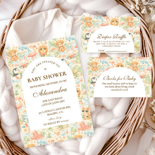 A whimsical watercolor design featuring a playful mix of pastel summer animals surrounded by tropical leaves, seashells, starfish, and soft botanical details. The cheerful palette of peach, mint, coral, and soft blue creates a light storybook atmosphere, while the elegant arch layout keeps the celebration details beautifully framed and easy to read. Perfect for a warm, joyful summer celebration with a charming nursery aesthetic.