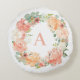 Ein kuscheliges botanisches rundes Kissen. Es ist mit einem Blumenkranz aus pastellfarbenen Pfirsich- und Elfenbein-Rose und mit Eukalyptus und anderen Akzenten im Grünen ausgestattet. Personalisieren Sie dieses blumengeschmückte Kissen mit einem Monogramm. Dieses Pfotenkissen ist ein personalisiertes Geschenk.