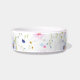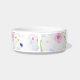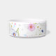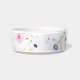 Diese Schüssel für einen Hund oder eine Katze hat ein Blumenbild von pastellblauen und rosa Blume vor weißem Hintergrund.