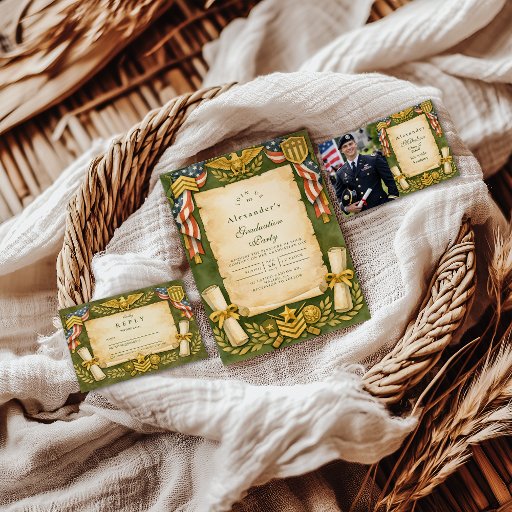 Celebrate a major milestone with this vintage-inspired patriotic graduation design. Featuring classic military-style insignias, laurel wreaths, banners, and a timeless parchment center, this invitation is perfect for honoring a graduate with strength, pride, and tradition. Ideal for formal or themed graduation celebrations with a bold, heritage-inspired aesthetic.