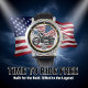This distinctive watch face features a prominent American flag waving in the background, behind a detailed black motorcycle. Large, stylized wings extend from the motorcycle's side, with additional red and blue feathered wings at the bottom. The overall design emphasizes patriotism and a love for motorcycling, with clear silver numbers and watch hands for timekeeping.