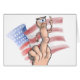 Ein anthropomorpher Mittelfinger, der den Finger mit einer amerikanischen Flagge im Hintergrund gibt. Illustriert durch Jeff Morin.