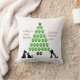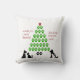 Ferienkissen für alle Liebhaber von Haustieren. Weihnachtsbaum aus Pfotendrucken, darunter ein Paar Hund & Katze. Wir wünschen Ihnen ein frohes Weihnachtsfest, fla la la la la la la, Bow wow, miau.. um den Baum geschrieben. Die Rückseite des Kissens ist rot mit verstreuten weißen Pfotendrucken.